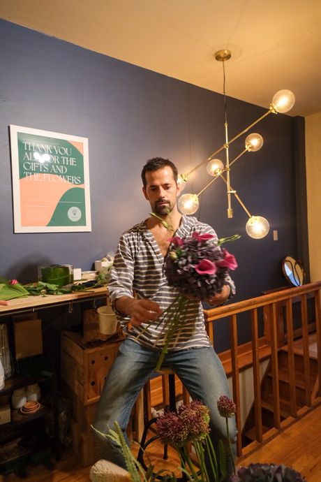 Fairchild enlisted his friend and fellow performer Adam Perry to work with him on creating arrangements, as the business has quickly grown since he started in early July. “I needed somebody who is both in the theater world and an incredible florist,” Fairchild says. “That was a no-brainer for me: It was my friend Adam Perry.” Fairchild can be seen below standing in his new apartment in his open living room/kitchen, where the pair work on a five-foot-long table. The duplex also has a larger table on the floor on the lower level, and soon there will be a walk-in flower refrigerator in the backyard.