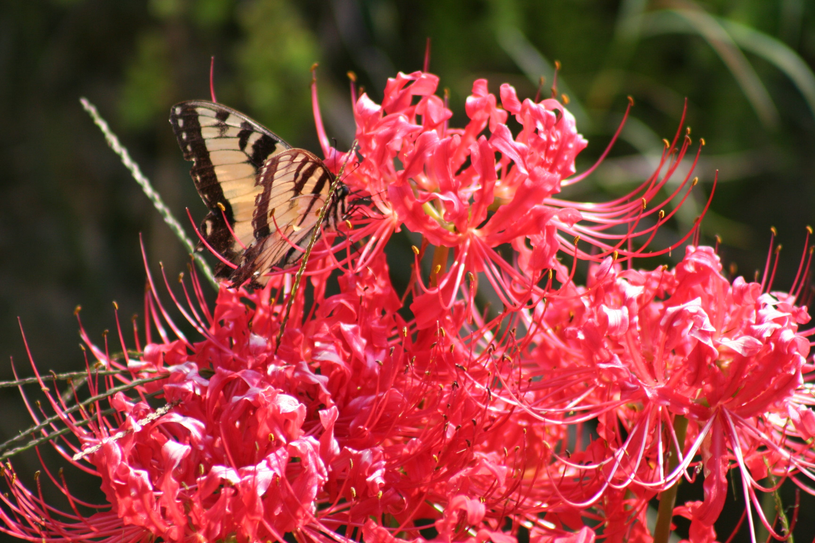 Red spider lily blooms after summer heat with showy red, funnel-shaped flowers that resemble daddy long-legs spiders upside down. Long stamens reach out from the petals that form on tall flower stalks. Six to 10 fine-textured blossoms crowd the top of each stem. They grow in full sun to part shade in well-drained soil but best flowering occurs in part shade.